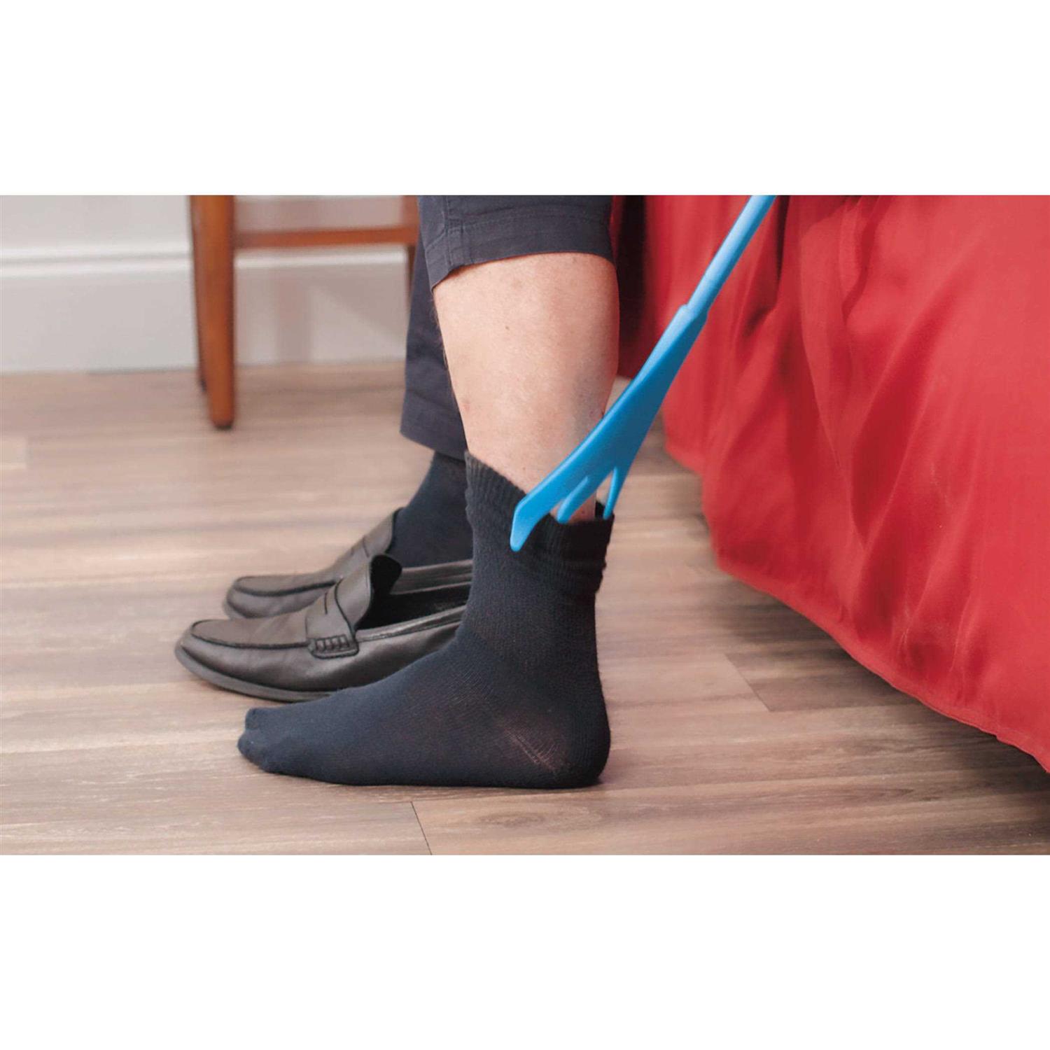 Effortlessly put your socks on and take them off with this sock slider. Crafted in a unique cradle design, this handy device expands and holds your socks open in the perfect position so you can slide your foot in without having to bend over.