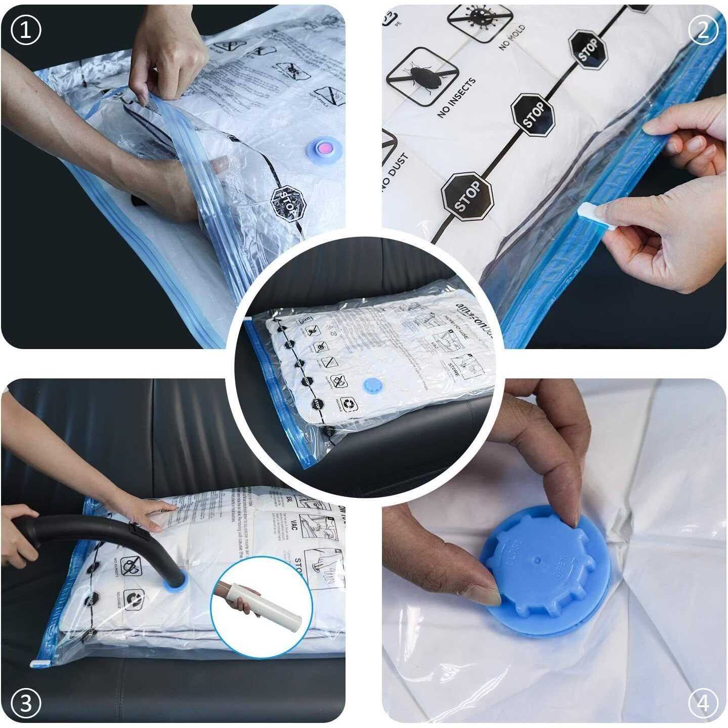 Set of heavy-duty plastic vacuum compression storage bags. Hand pump included, or connect to any standard vacuum cleaner hose for faster results. Heavy-duty valve and double seal zipper for air tight protection.