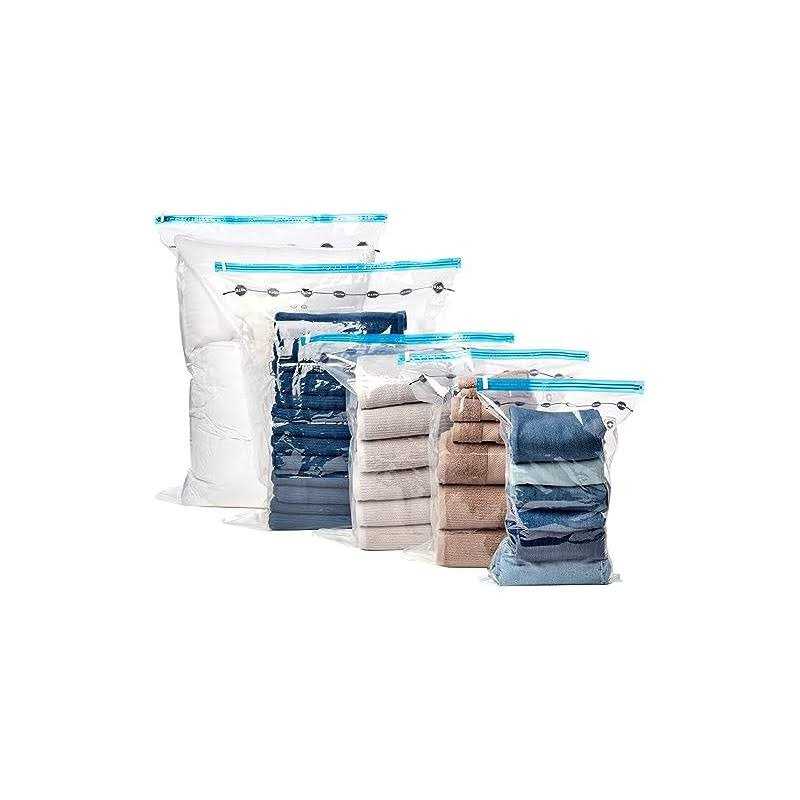 Vacuum bags save space by effectively compressing bulky textiles up to 80%, for compact and stackable storage under beds, in wardrobes, closets, wardrobes or suitcases Heavy duty double zipper and triple seal turbo valve for long-lasting airtight protection; please follow the instructions printed on the storage bags to ensure proper closure during use Durable and Reusable Space Saver Bags are made from thick layers of PA and PE films, which improve tear and wear resistance and help protect clothes from moisture, dirt, mildew, odor, etc. Includes hand pump for efficient air suction and convenient travel use; the valve can also be connected to a standard vacuum hose for faster deflation Bag dimensions: 2 x XXL (100 x 76 cm), 2 x L (80 x 60 cm), 2 x M (70 x 50 cm)