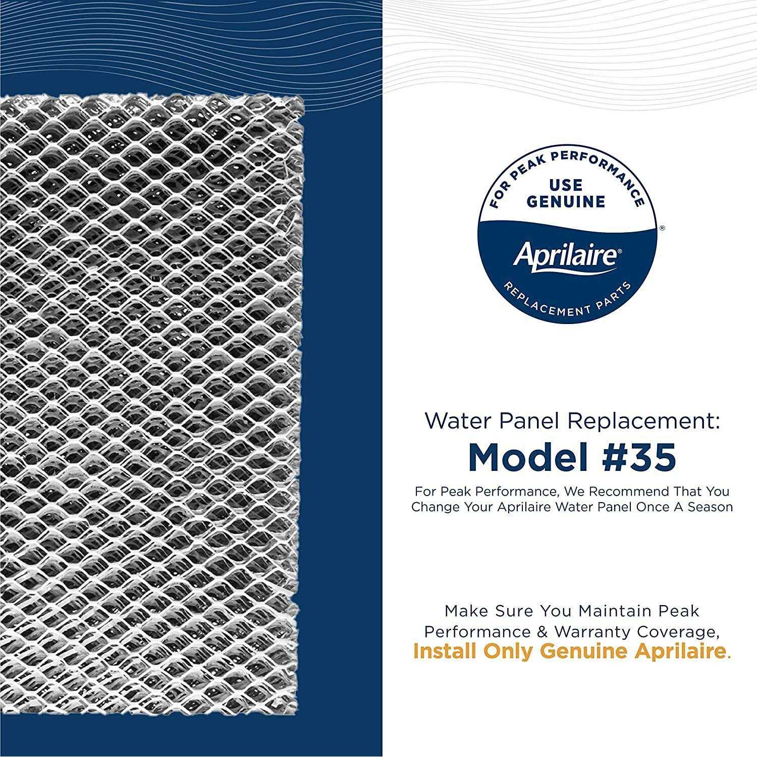 Maintaining proper humidity levels is integral to maintaining Healthy Air. This genuine AprilAire replacement water panel humidifier filter features a porous ceramic-type coating that absorbs water and maintains the proper level of hydration to support the evaporation process. Water is vaporized as air warmed by the furnace passes over the water panel humidifier filter carrying humidified air throughout the house through the air ducts. AprilAire has been there since the beginning by introducing the first whole-home humidifier in 1954. Healthy Humidity reduces the incidence and risk of respiratory infections from airborne viruses. It also helps remedy your dry skin, chronic sore throat, frequent nosebleeds, and static shock. Additionally, proper humidity levels protect your home’s wood furnishings from cracking or splitting while lowering your energy bill. Keep your AprilAire Humidifier running at peak performance by replacing your water panel annually. The Model #35 Water Panel dimensions are 10 inch W x 13 inch H x 1.75 inch D and illustrated instructions help you change your water panel quickly and efficiently.