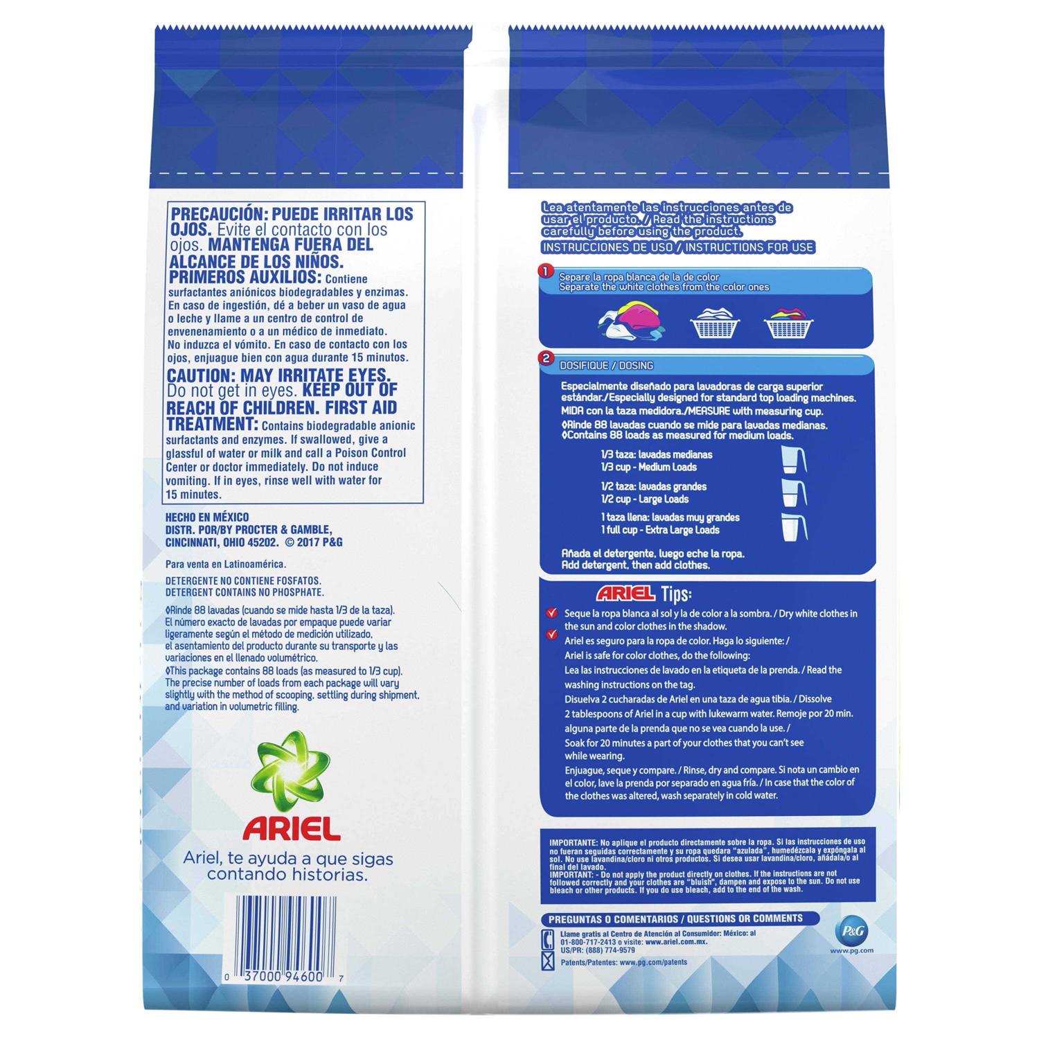 Remove stubborn stains from clothes without damaging them with the Original Laundry Detergent Powder from Ariel. This detergent powder cleans deep down into the fiber to not only remove tough stains but also prevent them from setting in. Formulated for washing white clothes, this laundry powder is 100% safe for colored clothes as well and doesn’t strip them of their original color. Plus, its great smell lingers on clothes to make you feel fresh and active. Ariel Powder Laundry Detergent is economical and effective for your laundry needs. Add detergent before adding clothes into your washing machine for the best results. For mediums loads use 1/3 cup of detergent, for large loads use 1/2 cup of detergent and for extra-large loads use 1 full cup of detergent. Avoid applying detergent directly to your clothes prior to washing.