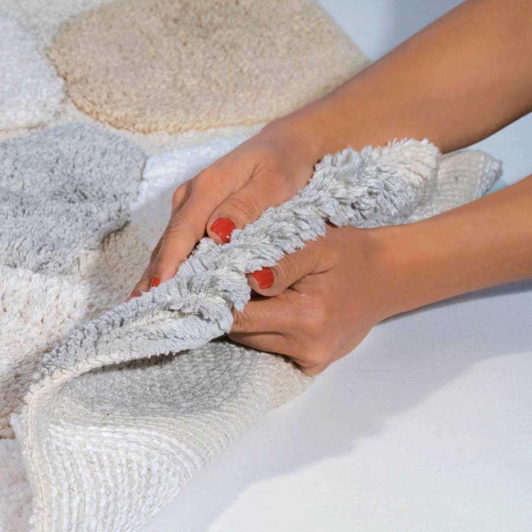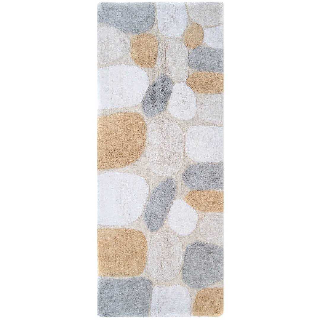 This bath runner is perfect for use in front of a double sink or tub! Our pebbles design features shades of different colors to bring a cool yet earthy feel to your bathroom. Use this to add both luxurious comfort and colorful style to your bathroom decor. The pebble pattern of this large bath rug runner features neutral and cool tones against a gray background. These bath rugs are spun of 100% Cotton. This bath runner is machine Tufted with a lightly sprayed anti-skid back.