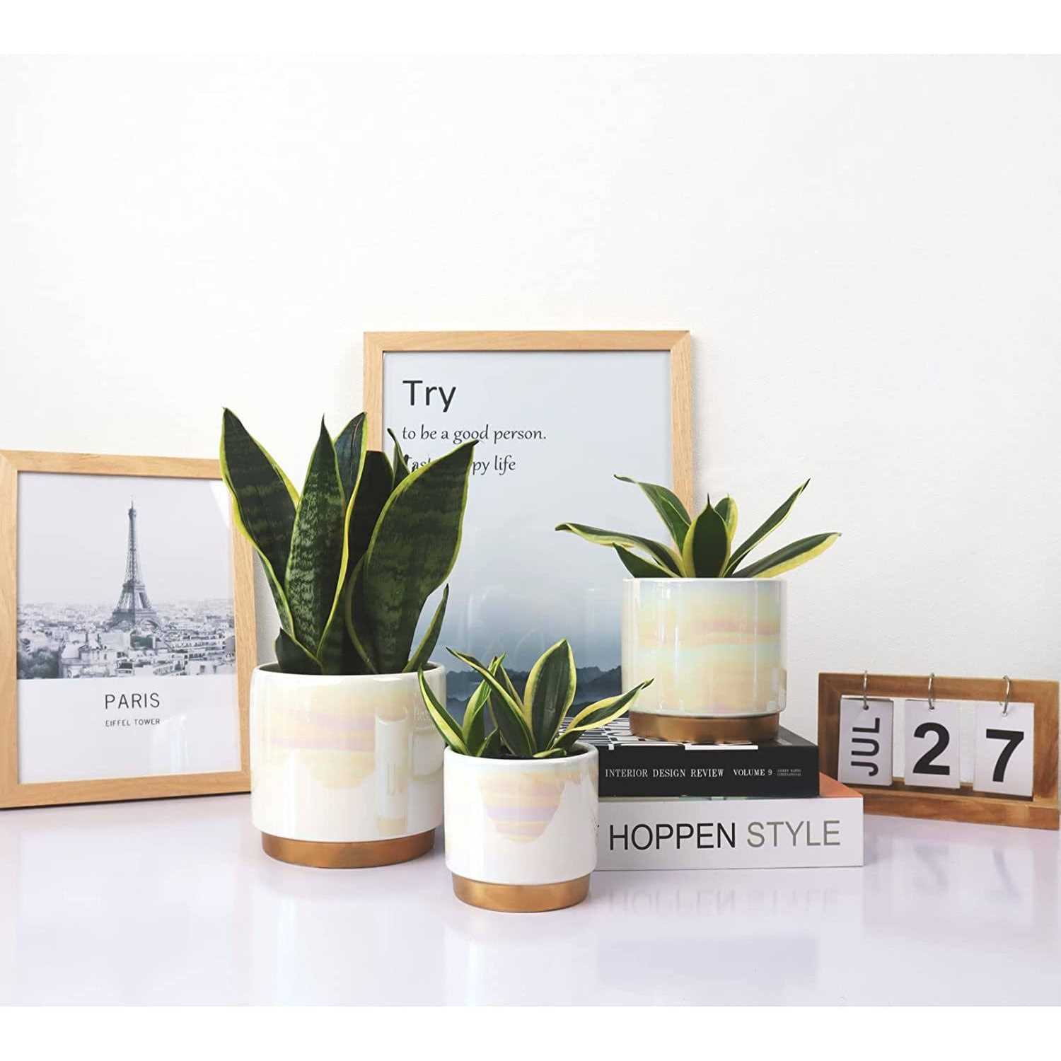 Brand: GepegeColor: WhiteFeatures: Rainbow Pearlescent Glazed Design With Drain Holes: The rich color of this ceramic flower pot is covered a rainbowl look. Deep planting space promotes root growth to keep plants healthy. Large drain holes are good for draining, it is suitable for orchids, succulents, cacti, other flowers and green plants, perfect for home decoration. Premium Material: This ceramic pots can tolerate extreme temperatures because they are high-temperature fired stoneware. Rainbow style design will make your balcony and living room more concise, bright and full of artistic sense. Great for home, office, windowsill, desk, living room, house, shelf, kitchen decor. From outdoor options for your patio to indoor for your windows Size & Package: 6.0 Inch Pot + 5.0 Inch Pot + 4.0 Inch Pot. Package: contains 3 ceramic flower pots, 3pcs mesh pads and 3pcs rubber stopper (NOT INCLUDE PLANTS) Makes Great Gift: It’s the perfect suitable present for your relatives and friends, they make great birthday gifts, anniversary gifts, Housewarming gifts, Thanksgiving or Christmas gifts and more! Cup-shaped retro planters are good for orchids, succulent, cactus, other flowers and green plants, large plant containers can be placed on tabletops, windowsills and floors. Material: Ceramic Package: 3 ceramic flower pots, 3pcs mesh pads and 3pcs rubber stopper (NOT INCLUDE PLANTS). EAN: 0784624831935Package Dimensions: 8.0 x 8.0 x 7.3 inches