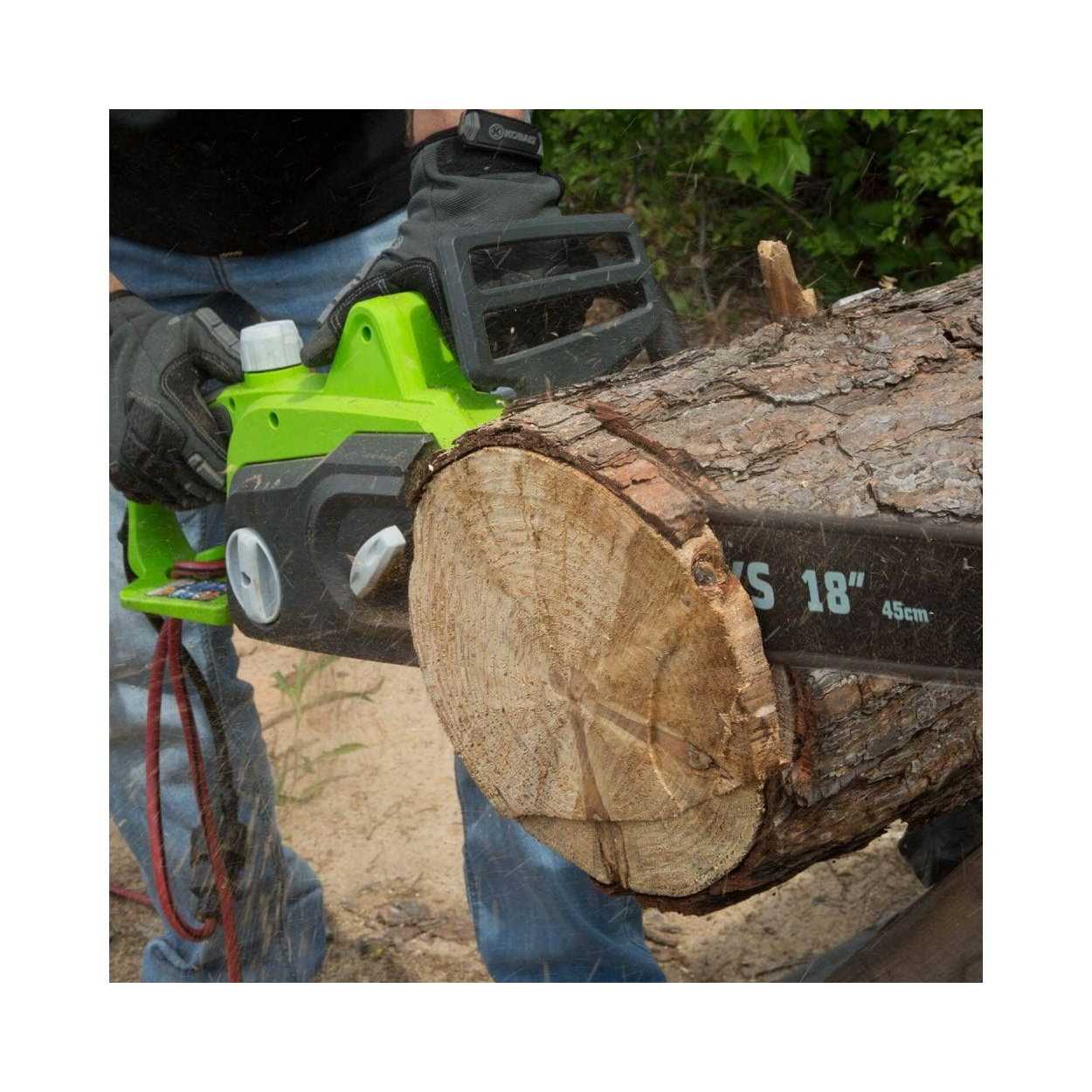 This quick-starting Greenworks Electric Chainsaw delivers powerful torque to complete the task at hand. The electric motor requires no pull cords for fast, easy starts. 18in. bar and chain., 14.5 Amp electric motor starts easily and requires no messy gas or oil mixtures or pull cords 18in. bar and chain with 0.050in. chain gauge and 3/8in. LP chain pitch offers high-performance operation designed to cut through large debris Hassle-free cutting with tool-less chain tensioning for quick adjustments Auto-oiler system provides superior lubrication while you work Wrap-around handle offers multiple cutting positions and reduced user fatigue Model Number: 20332. Age Group: adult.