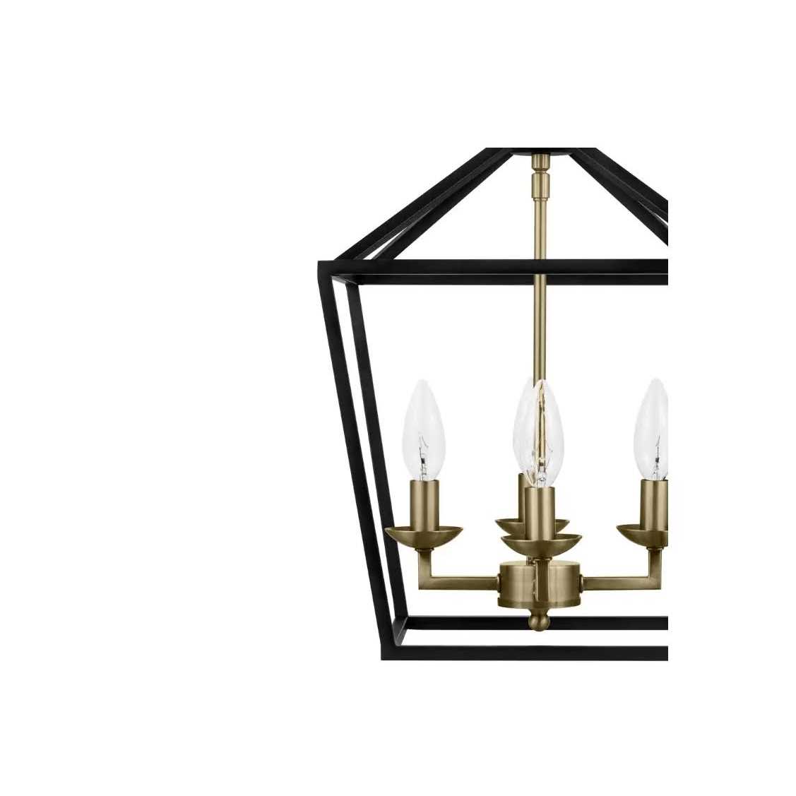 The Weyburn Collection exhibits farmhouse style indoor lighting with rustic, industrial appeal. Enhance your entryway, kitchen or dining room with the classic styling of this 4-light chandelier. Highlighted by a 2-toned black and gold finish and contemporary metal birdcage, this fixture adds a warm glow to a variety of indoor spaces. The open caged shade exposes the candelabra style bulbs for a classic look, perfect for providing ample task lighting. This adjustable chandelier is mounted with a matching ceiling canopy and includes 5 ft. of chain for a customizable suspension height. Farmhouse chandelier with a trendy, 2-toned black and gold finish Includes 60 in. chain for adjustable hanging height from 20 in. up to 79 in. Round ceiling plate measures 5 in.