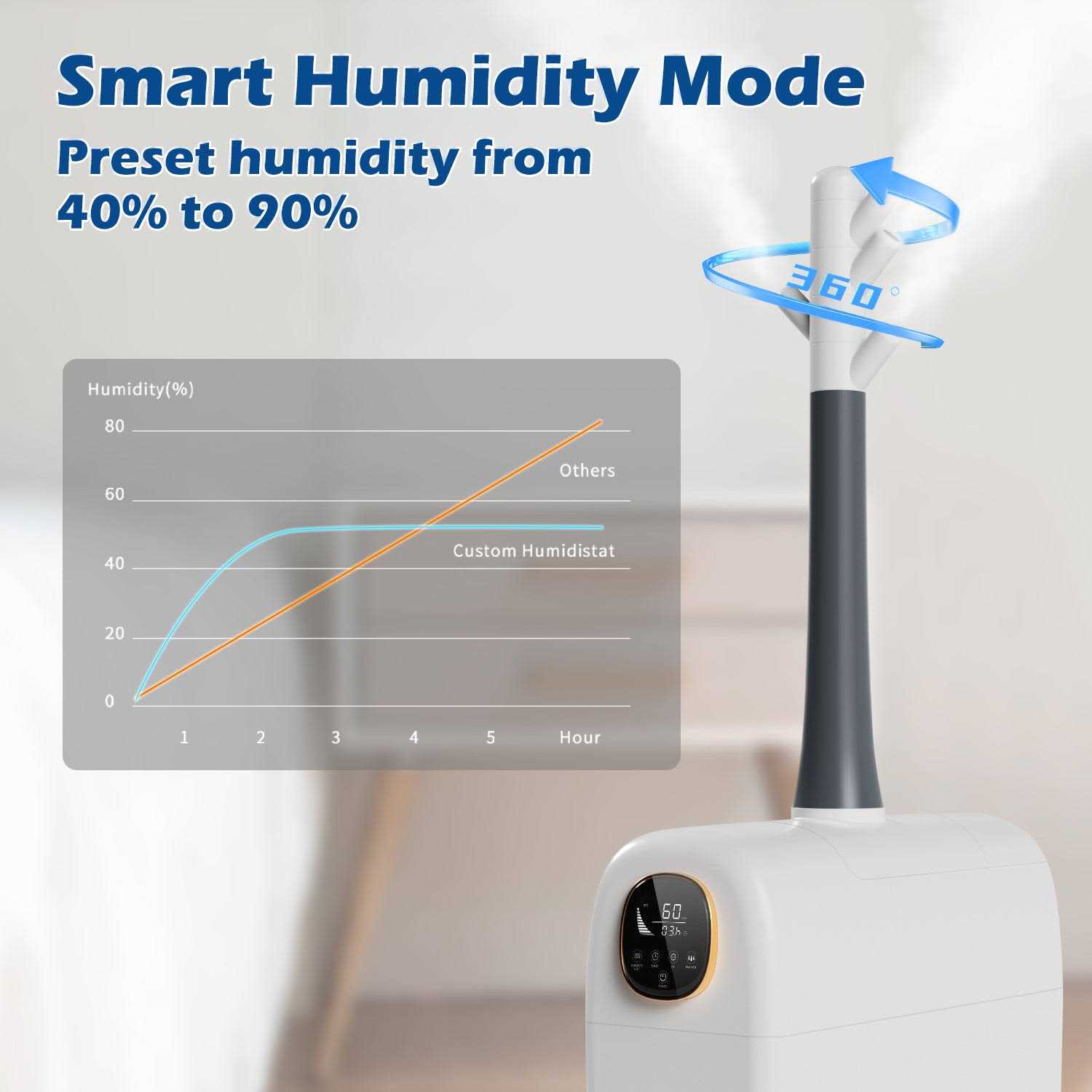 6.6Gal large capacity lasts up to 36 hours working time at one top fill. 2000mL/h high moisture output is designed to humidify spaces up to 3000 sq. ft, such as whole houses, greenhouses, supermarkets, warehouses, office, factory, etc!!!