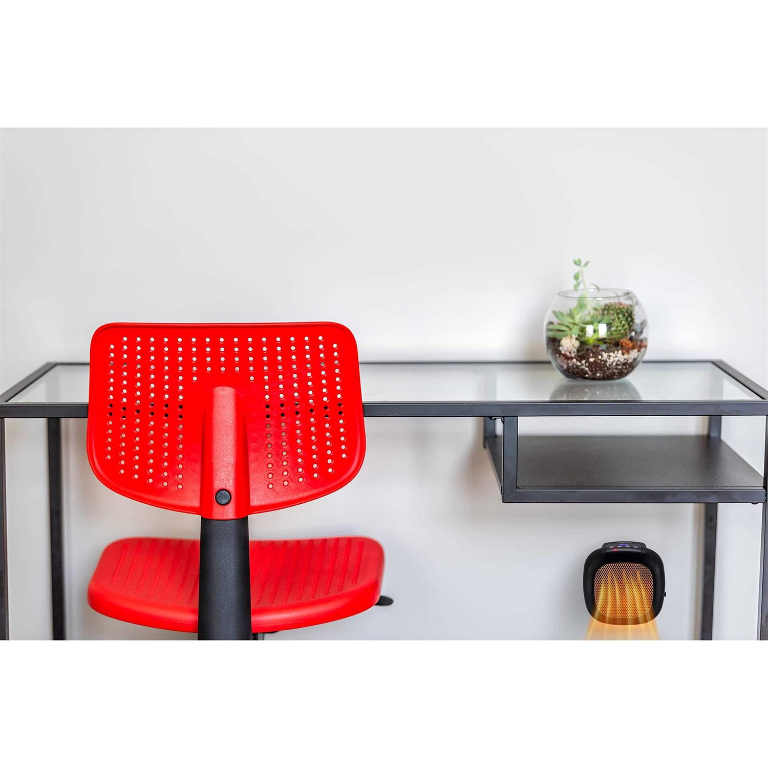 This small, compact heater is great for home offices and small spaces. The 2 heat settings, digital display, and adjustable thermostat ensure your space stays at your preferred temperature. Can adjust the thermostat from 59°- 86°. Finally, keep peace of mind with our cool touch housing, grill, and overheat protection with its 60-second cooldown function.