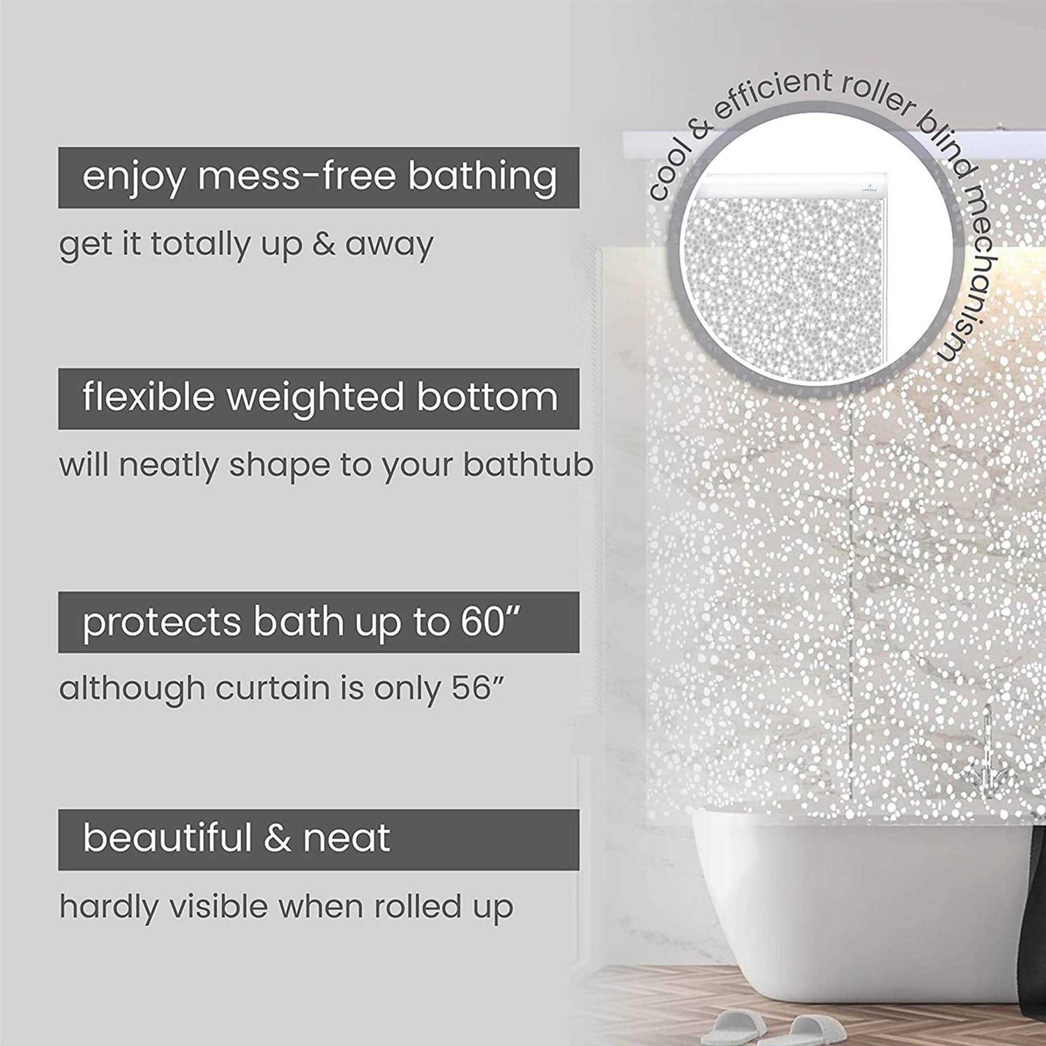 Is your shower curtain looking a little dull? Upgrade your bathroom with our roll up shower curtain! It keeps your bathroom tidy and clutter-free to give you a clear view of all the other gorgeous bathroom fixtures. This shower screen won’t get in the way while you’re bathing, unlike those pesky plastic curtains that keep falling off from their rings. With this revolutionary waterproof shower curtain, you no longer need to worry about your bulky shower curtain sitting on the shower rod and taking up space. Simply roll it away when you are done showering to brighten up your bathroom and make it look more spacious. The 100% PEVA long bath liner securely and neatly hides in its thick aluminum base, too! Keep your bathroom organized and clean with the Jakooz Rollup Shower Curtain! The decorative clear and clean 3-D design of this rollup shower screen is sure to work with any bathroom decor! It becomes completely invisible to allow the style and tile of your bathroom to be the focal point. Our heavy duty shower curtain is designed to fit standard 60-inch bathtubs. The actual size of this curtain is 95 inch x 56 inch, and it features a weighted bottom to keep it securely in place and shaped inside the tub to prevent water from escaping. Enjoying your me-time in the bath has never been easier. With our no-rod, no-hooks and no-rings bathroom curtain, you can say goodbye to messy shower curtain rings and hooks and achieve the richness of a glass shower door with this sleek and straight look! Luxury awaits you in the bath. Add the Jakooz Rollup Shower Curtain to your cart today!