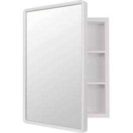 Level drill pencil and measuring tape and drywall saw may be required for cabinets that can be installed in a recess application. Left or right hand opening. Continuous piano hinge. 12-in beveled mirror on door exterior. 2 adjustable steel shelves. Drawn steel body finished with rust resistant treated steel and heat cured white acrylic paint.