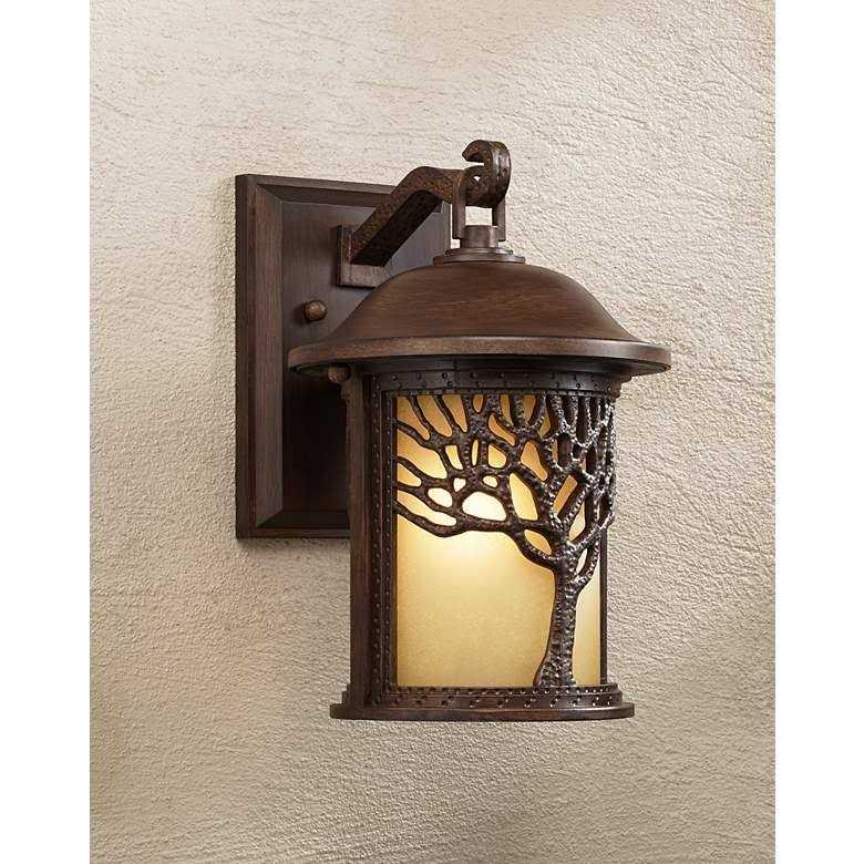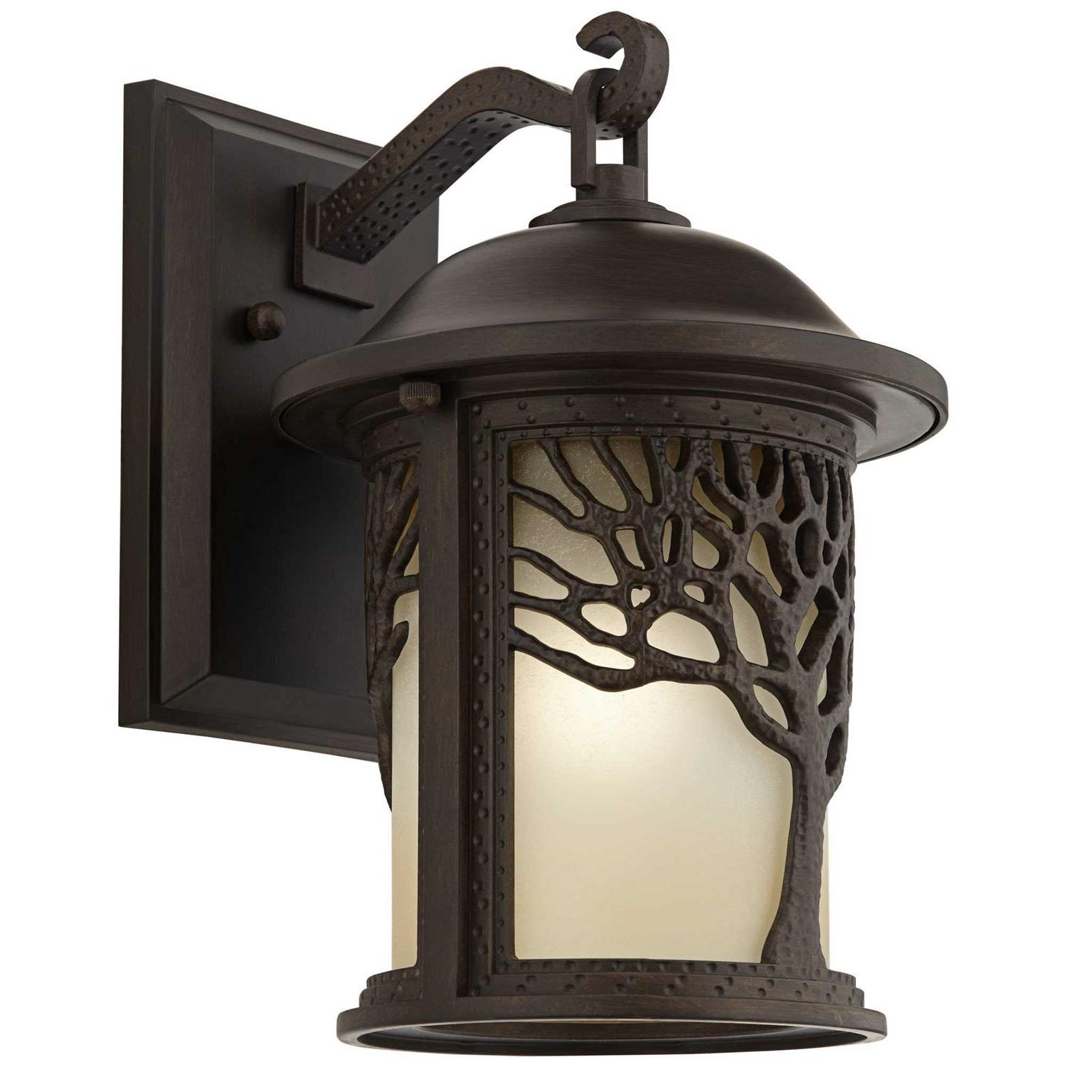 This Mission style outdoor wall light has an appropriate stately tree design that has been inspired by nature. A rounded cream diffuser offers warm light and rests behind the organic design. A wonderful way to brighten your exteriors while keeping the natural outdoors in mind. From John Timberland brand of outdoor lighting, inspired by classic Craftsman, Arts and Crafts, and Mission style lantern lights. 12 1/4″ high x 8″ wide. Extends 10″ from the wall. Backplate is 8″ high x 5 1/2″ wide. Weighs 5.06 lbs. Uses one maximum 60 watt standard-medium base bulb (not included). Inspired by Craftsman, Arts and Crafts style lantern lights. From the John Timberland brand of decorative outdoor lighitng. Bronze finish backplate, top arm, and housing with tree motif. Cast resin construction. Amber glass casts a warm glow. Wet location outdoor rated for areas like porches, garage areas, and patio spaces that get full exposure to rain and weather.