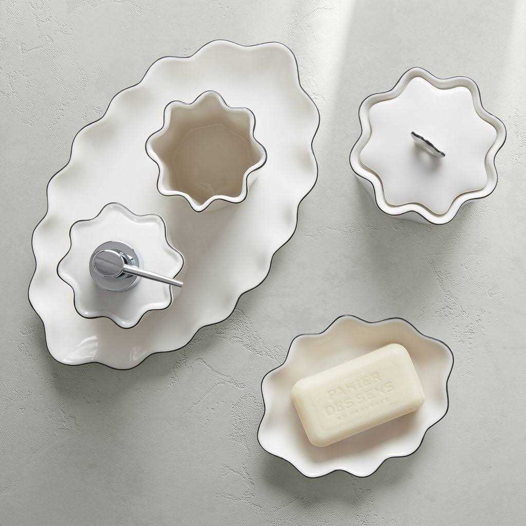 Introducing the Mare collection- where whimsy meets timeless elegance. Crafted from delicate porcelain, each piece in the Mare collection boasts a whimsical scalloped design, reminiscent of ocean waves, in classic white. Dive into creativity as you mix and match to create your perfect bath sanctuary. Mare lets you customize your space, piece by piece. Black-tie detailing- along the top of each collection piece, discover a touch of sophistication with a sleek black-trimmed accent. Let the whimsical waves inspire tranquility in your space. Discover Mare today, where each piece is a testament to your unique style.