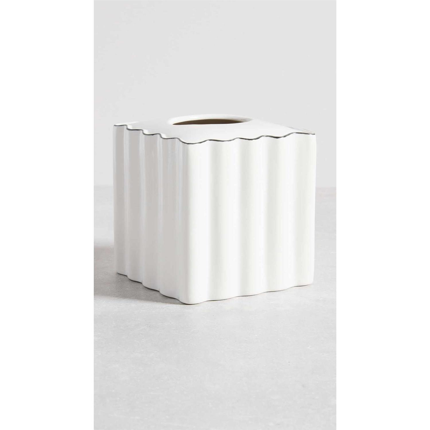 - Kassatex’s signature glazed white porcelain composes this tissue dispenser, which gains a unique look from wavy sides.