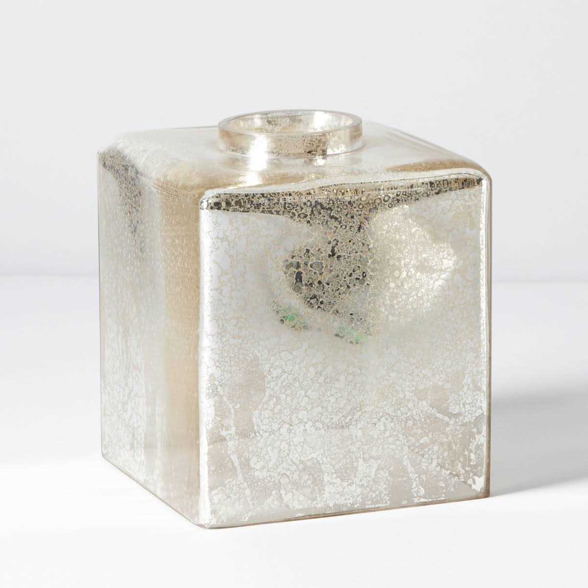 Tissue box cover finished to look like mercury glass. Dimensions are approximate. 5.5″Sq. x 5.25″T. Imported.