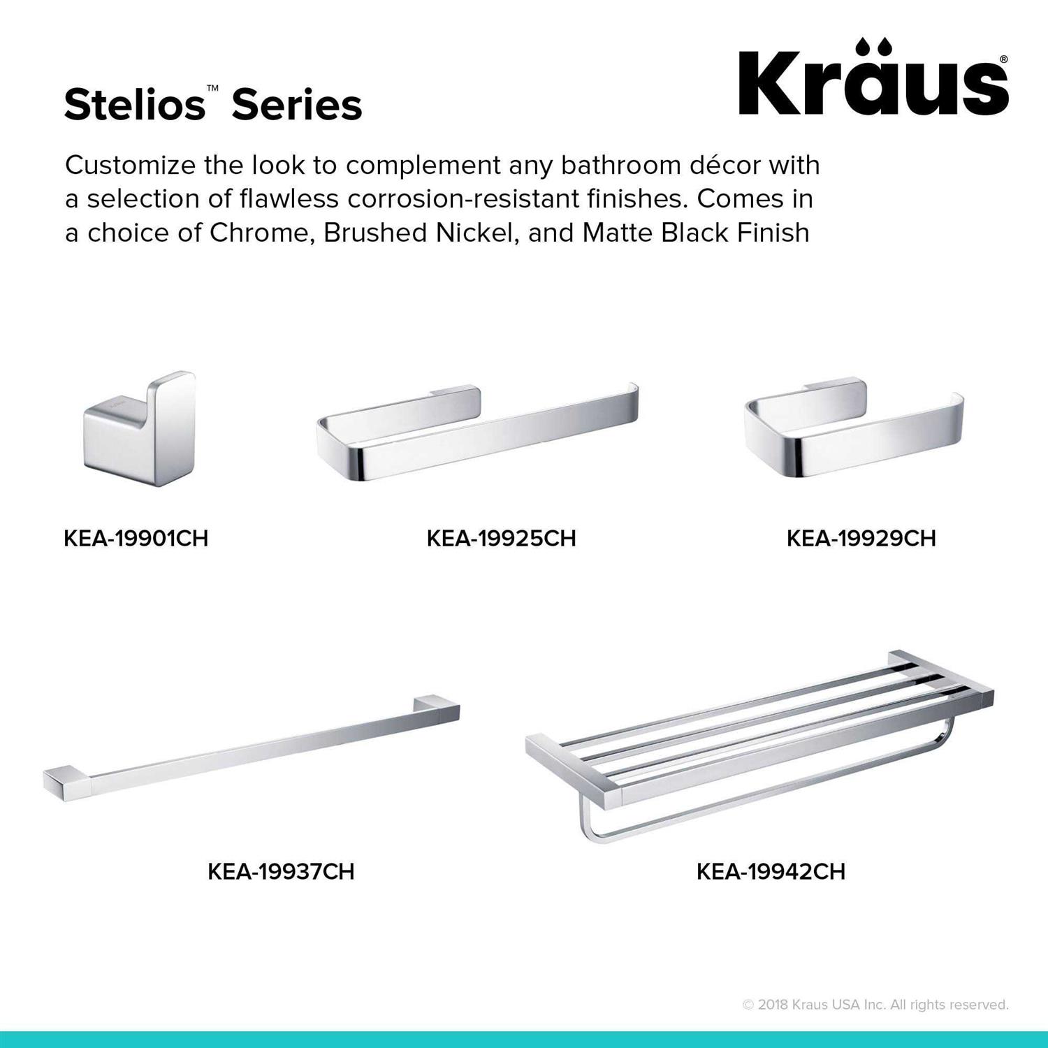 The Stelios bathroom accessory collection features geometric forms with tight angles that add a contemporary edge to any bathroom decor. Solid brass construction offers maximum durability, with a range of finish options for a customized look. For over a decade, Kraus has been transforming ordinary spaces into extraordinary kitchens and bathrooms, with the goal of bringing quality and value into every home.