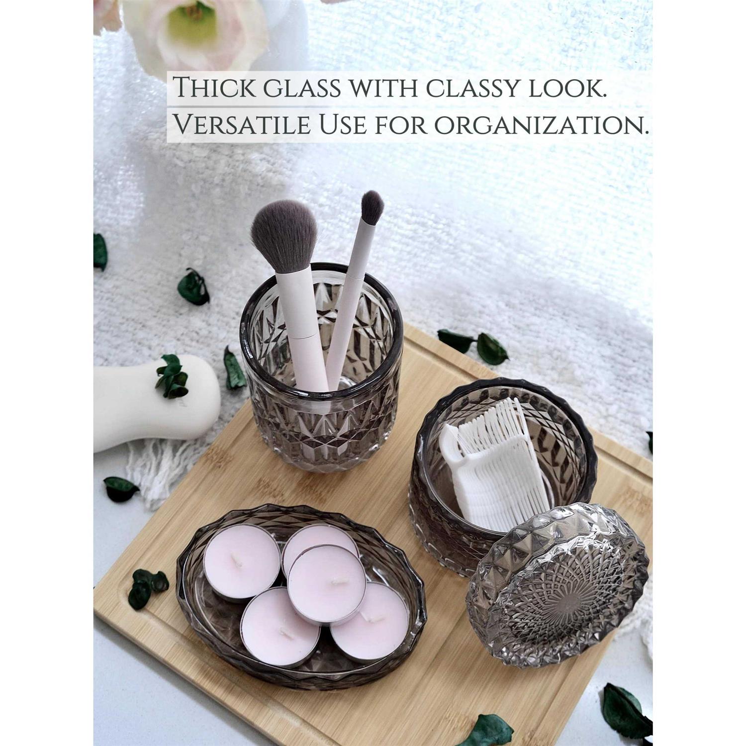 Glass 【Practical 5pcs Set Includes】 1 Soap Dispenserwith 12.8 oz, 1Tumbler, 1Soap Dish, 1Toothbrush Holder, 1 Jar for cotton swab or cotton pads 【Multifunctional】 5pcs Grey Black Glass Bathroom Accessories will keep your bathroom tidy and organized. You can use these items together in your bathroom counter, your restroom, or you can use individual piece, such as tumbler for makeup tools, razor or pens, dispenser for lotion, soap and more. It is also a stylish decoration full of vitality for your monotonous ordinary bathroom, easy to match with different styles. 【Premium Quality】 The Vintage glass set is made of thick and durable glass, it’s heavy weighted with golden ABS pump and it’s not easy to be broken or tip over. 【Easy to Clean】 The advantage of the material brings it very easy to keep clean and stainless. You can clean it only with detergent or flow of water. 【Perfect Gift Set】The smoky gray black set comes beautifully packaged, making it a perfect gift choice for housewarmings, weddings, birthdays, or any other special event. Surprise your loved ones with this practical gift that enhances their bathroom decor while providing convenience and style.