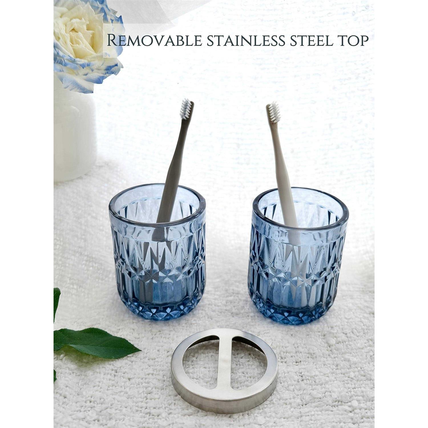 Glass 【Practical 5pcs Set Includes】 1 Soap Dispenser with 12.8 oz, 1Tumbler, 1Soap Dish, 1Toothbrush Holder, 1 Jar for cotton swab or cotton pads 【Multifunctional】 5pcs Navy Blue Glass Bathroom Accessories will keep your bathroom tidy and organized. You can use these items together in your bathroom counter, your restroom, or you can use individual piece, such as tumbler for makeup tools, razor or pens, dispenser for lotion, soap and more. It is also a stylish decoration full of vitality for your monotonous ordinary bathroom, easy to match with different styles. 【Premium Quality】 Unlike fragile ceramic or inferior plastic options, our modern crystal glass accessories are made from thick and durable glass, providing a luxurious and sturdy feel. The heavy weighted design, paired with the silver ABS pump, ensures stability and prevents tipping or breakage. 【Easy to Clean】 The advantage of the material brings it very easy to keep clean and stainless. You can clean it only with detergent or flow of water, saving you time and effort. 【Perfect Gift Set】The light blue glass set comes beautifully packaged, making it a perfect gift choice for housewarmings, weddings, birthdays, or any other special event. Surprise your loved ones with this practical gift that enhances their bathroom decor while providing convenience and style.