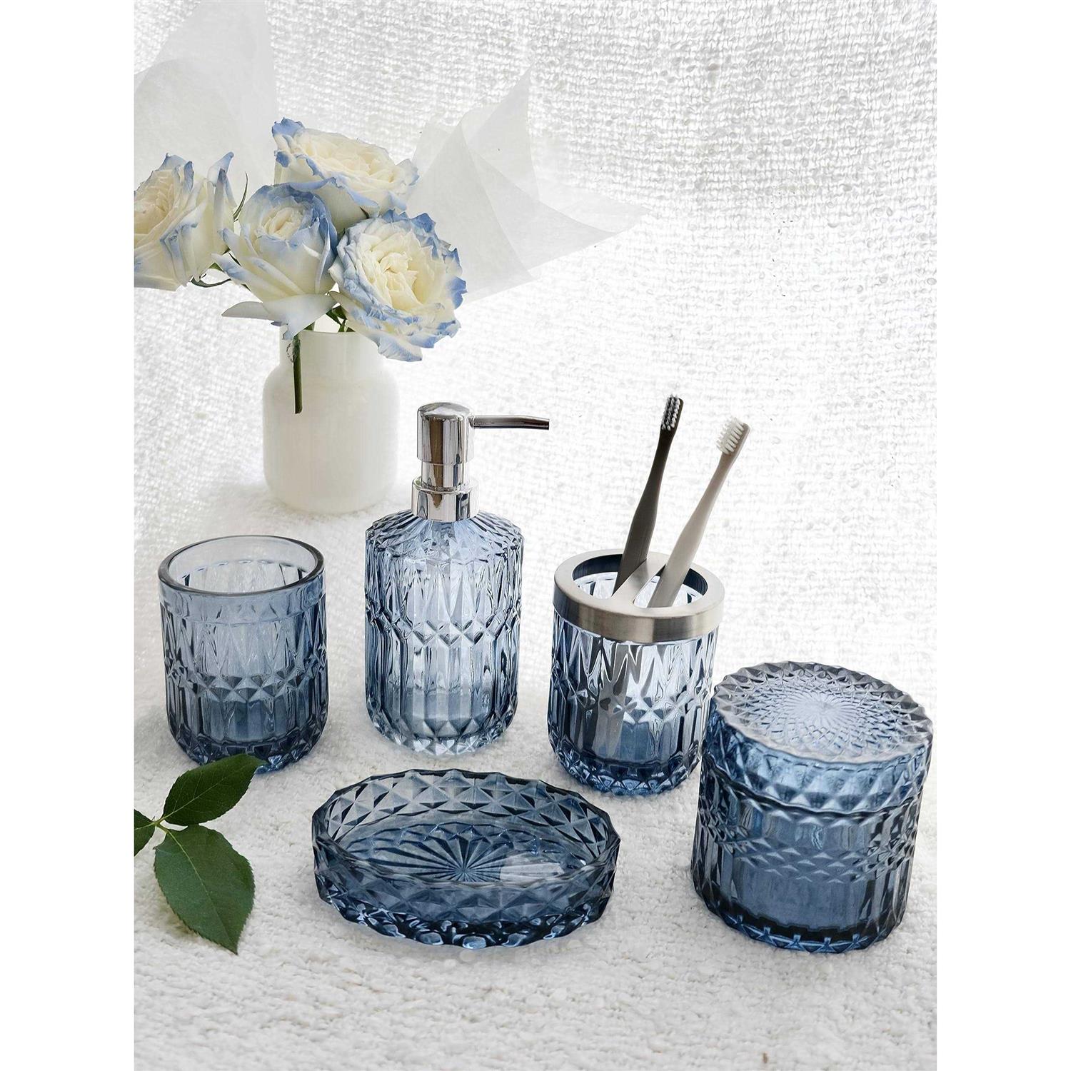 LaMarriti 5pcs Blue Glass Bathroom Accessory Complete Set, Lotion Dispenser, Soap Dish, Tumbler, Cotton Swab Jars, Toothbrush Holder Set, Modern