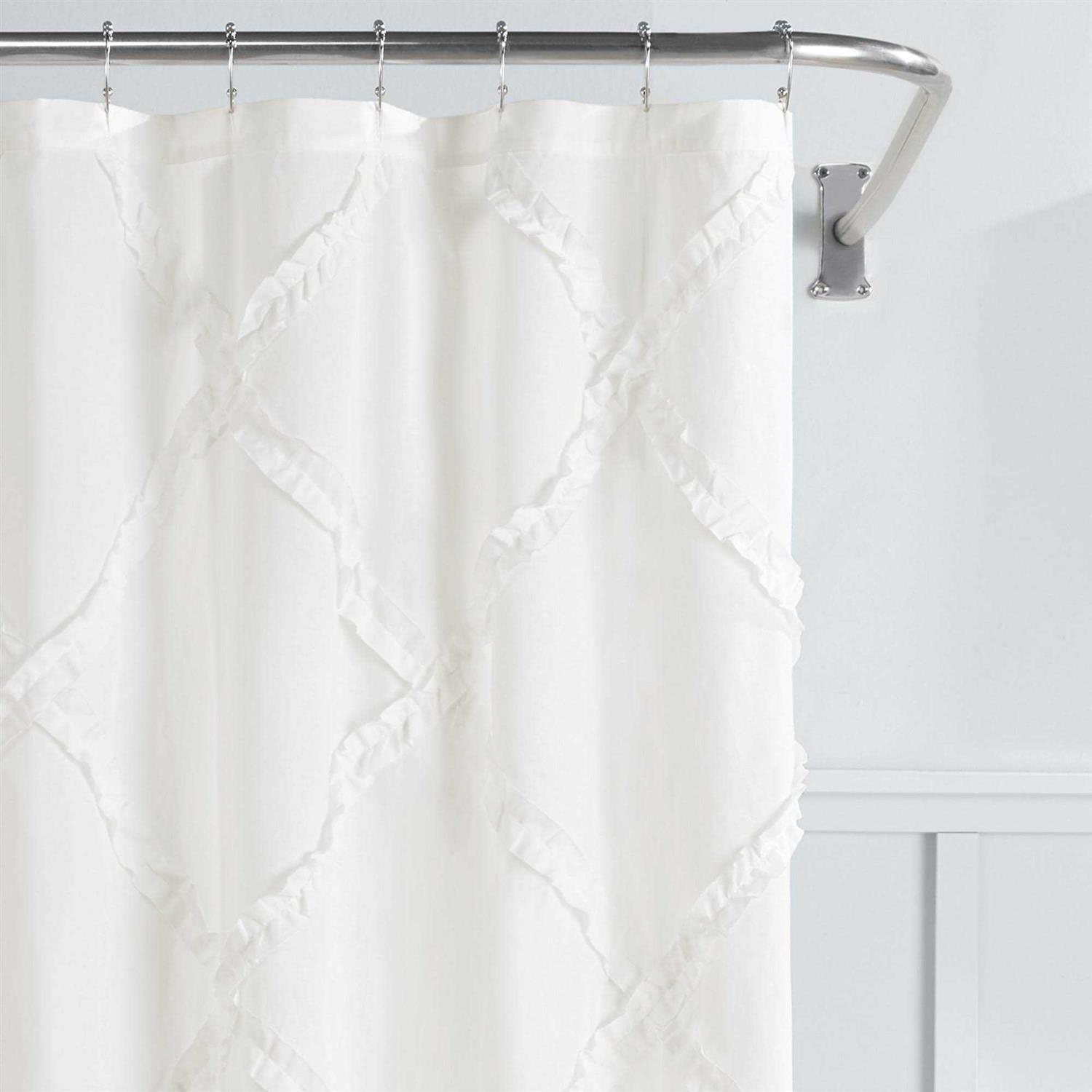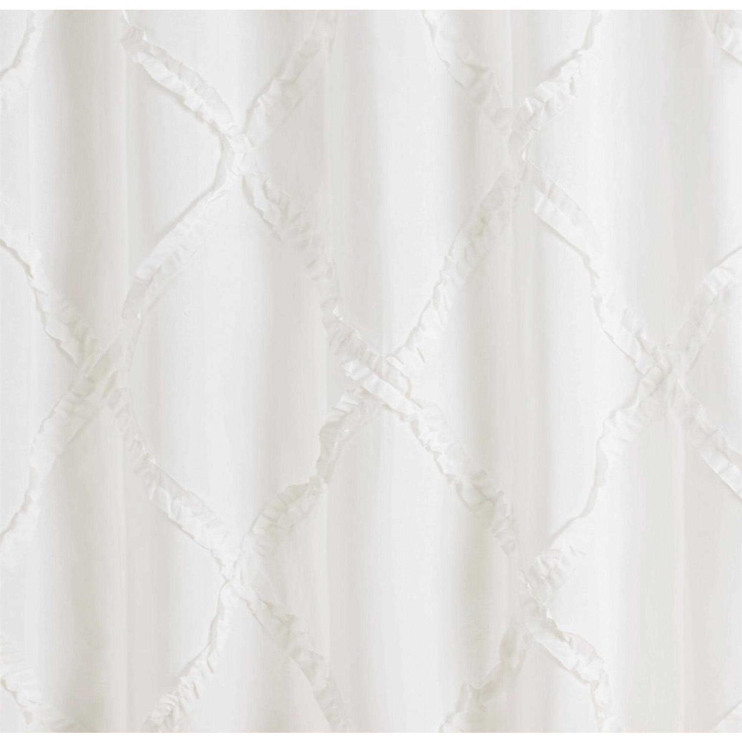 • Elegant white on white shower curtain featuring a dimensional lattice with an appliqued ruffles