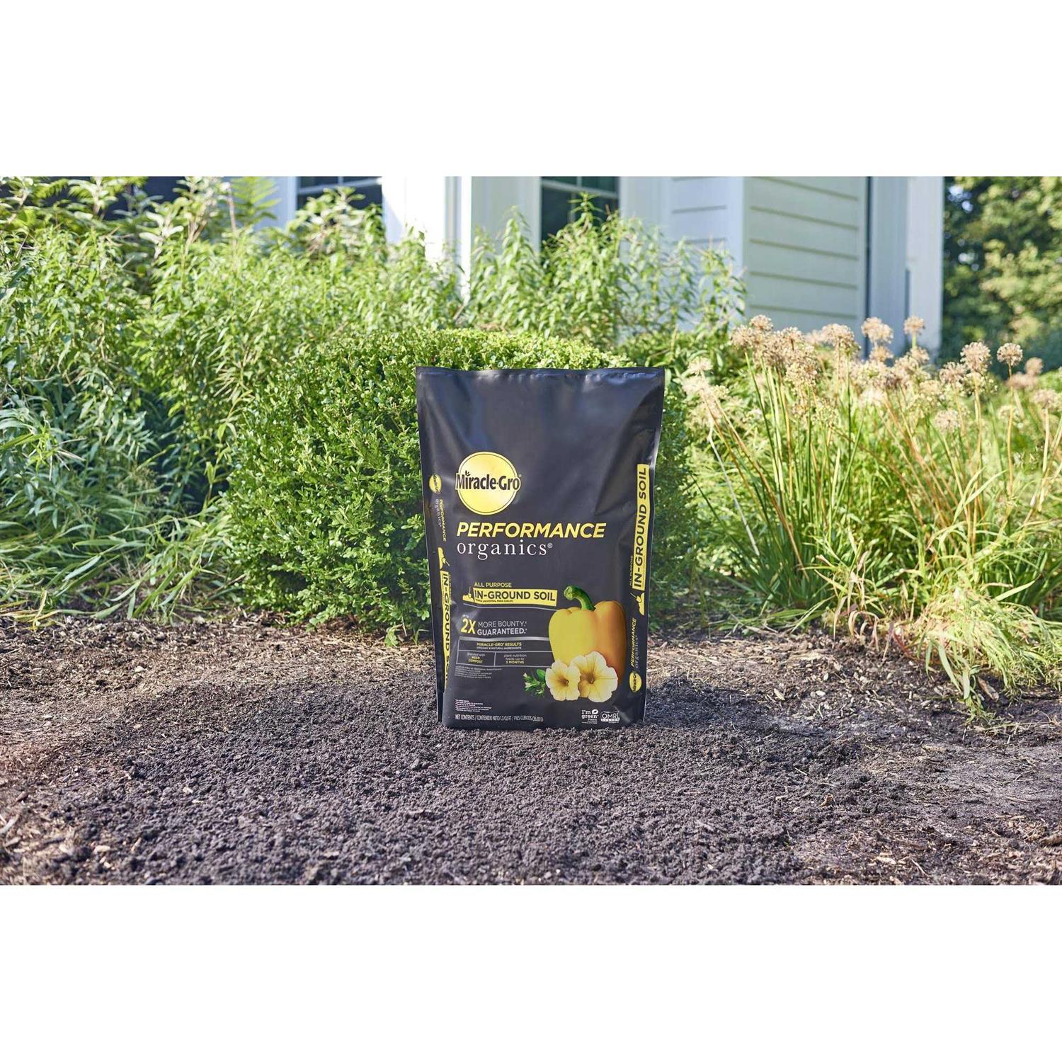 Miracle-Gro Performance Organics All Purpose In-Ground Soil delivers up to 2X more bounty (vs unfed plants)! Key Product Features Use for growing vegetables, flowers, and herbs, and amending garden beds Feeds plants for up to 3 months Provides air space for root development, a wetting agent to improve water absorption, and compost provides structure and organic matter to improve nutrient retention Mix-in with native soil at the planting area or use as part of a planter mixture Not available in the state of California Includes ingredients such as perlite, peat coir, yucca, compost, and sphagnum peat moss Enjoy Miracle-Gro results with organic and natural ingredients OMRI Listed for organic use Miracle-Gro Performance Organics All Purpose In-Ground Soil will feed your plants for up to 3 months. Also, this soil has been specially designed for planting in-ground and can be used as part of a planting mixture for raised beds. Formulated from natural and organic ingredients like processed forest products.