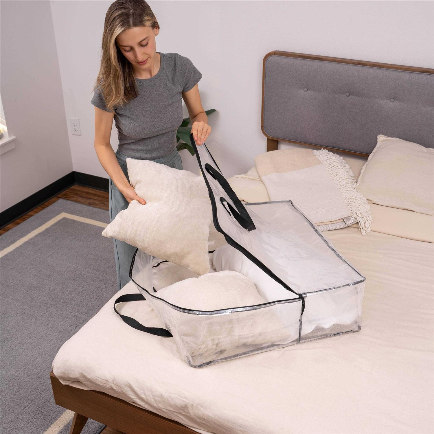 EXTRA-LARGE: 25.6″ L X 25.6″ H X 8.7″ D – 25 Gallon volume. Super large capacity and spacious tote bag can store many items such as Christmas wreaths, cushions, camping gear, stuffed animals, party supplies, home décor, holiday decorations, tires, wheels, sports equipment, strollers, frames, sleeping bags, foldable bicycles, bedding, pillows, clothes, comforters, blankets, sheets, linens, towels, quilts, shoes, purses, laundry, and more. SEE-THROUGH DESIGN: Clear, transparent design lets you easily view stored contents for quick identification without needing to search or open the bag. Made of sustainable, water-resistant, high-grade, durable premium polypropylene woven fabric material that is built to last. Thick, tear-resistant, and puncture-resistant material keeps your items safe from moisture, dust, dirt, and humidity. A minimalist’s choice for storage solutions. Easy to clean with wipes. HEAVY-DUTY & DURABLE: Stands upright and can safely hold up to 50 lbs. Heavy-duty handles are reinforced with 3 layers and cross-stitched to increase strength and load bearing capacity. The long, strong, and thick poly webbing carrying handles conveniently allow for easy carrying, ability to be hung on a wall, and easy pulling and sliding from under your bed. A sturdy, smooth, dual tab 3-sided premium zipper goes down the edges allowing the bag to open wide for easy loading and unpacking. MULTI-FUNCTIONAL: Essential for storing, moving, transporting, camping, organization, space saving, and travel. Great to use and store in the garage, closet, cabinet, basement, attic, and under your bed. Perfect for storing Christmas wreaths and decorations, transporting clothes and bedding when moving into your apartment or dorm, keeping outdoor cushions clean during harsh weather or in between parties, bringing blankets or gear for your camping trip, and hanging sports equipment in the garage. STORAGE BIN & MOVING BOX ALTERNATIVE: A lightweight, economical, and convenient alternative to storage bins and moving boxes. Less bulky, easier to carry and move, and easier to see contents inside. No extra packing supplies are needed, just unfold, unzip, and begin packing or loading. Stackable and can be hung to save room space. Collapsible and foldable when not in use for easy compact storage in your closet, drawer, cabinet, car, or garage.