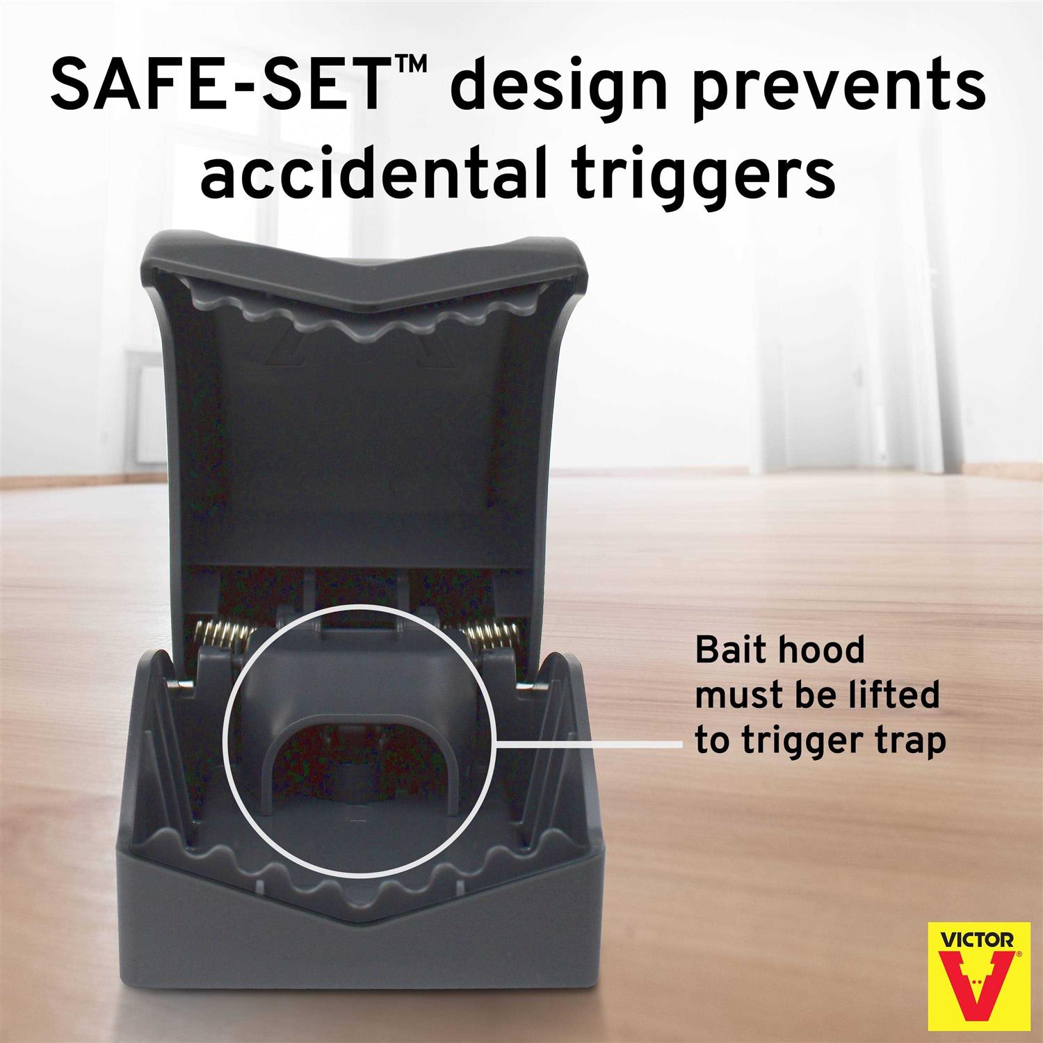 The Victor Safe-Set Rat Trap was designed with safety in mind. The Safe-Set feature was engineered to prevent accidental triggers while still keeping the elimination clean and humane. Not only is it safe for use around kids and pets when used as directed, it is also easy to use regardless of your experience level. The trap can easily be set with 1 quick click using your hand or foot. Then just place the activated trap into a location with rodent activity. For your convenience, the unique bait hood eliminates bait theft. When rats approach for a treat, the trap immediately springs closed to eliminate the pest on contact. All that’s left to do is dispose of the rodent and clean the trap so it’s ready to use again and again. With another quick click you can easily release and dispose of the rodent.